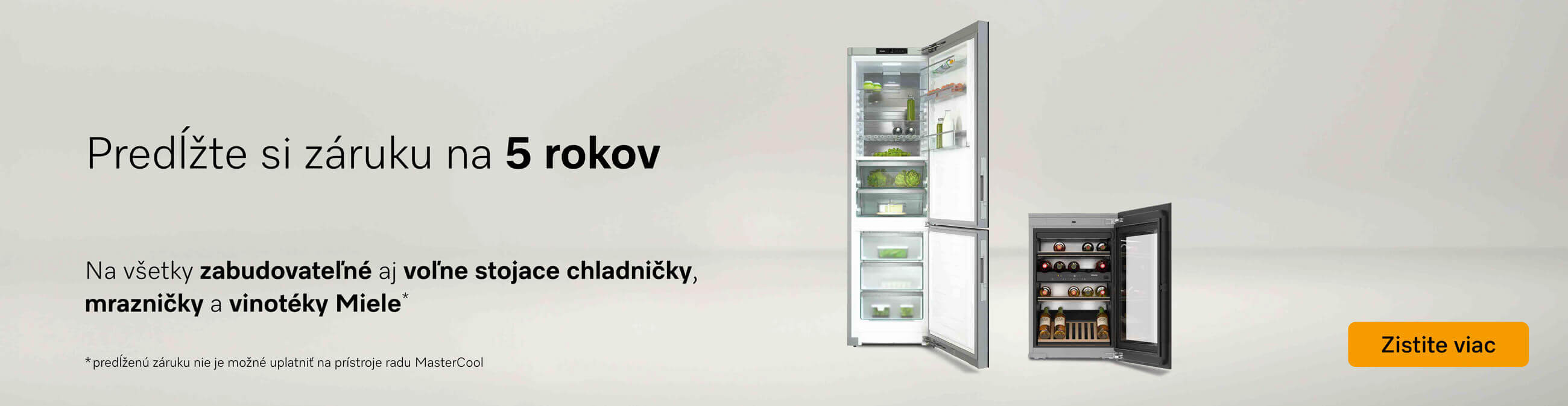 Pri kúpe akéhokoľvek prístroja zo sortimentu chladenia Miele (vstavané aj voľne stojace chladničky, mrazničky aj vinotéky) od nás získate o 5 rokov dlhšiu záruku úplne zadarmo na celý prístroj.
