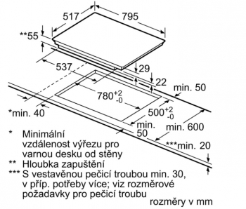 Rozměry: Příkon: 7,4 kW Připojovací kabel (1,1 m) Minimální tloušťka pracovní desky. 30 mm Rozměry (v x š x h): 55 x 795 x 517 mm Instalační rozměry (ŠxHxV): 780 x 500 mm