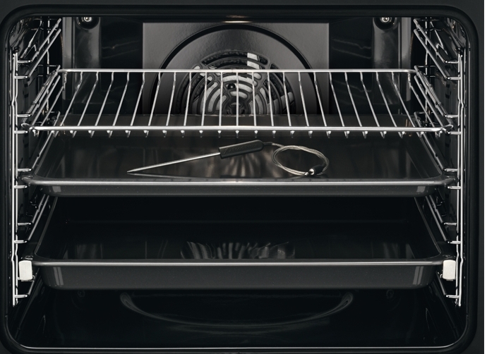 Výbava trouby - plechy: 1 smaltovaný koláčový plech na pečení, 1 odkapávací pekáč šedý smalt