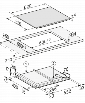 Rozměry výřezu v mm (hloubka) při instalaci bez rámu 500
