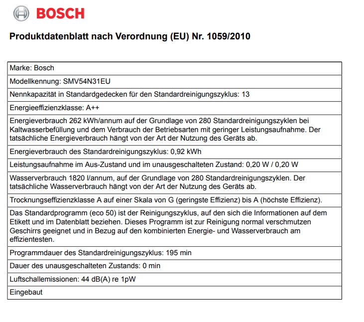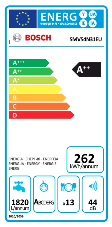 Spotřeba energie 262 kWh / rok na základě 280 standardních mycích cyklů s plněním studenou vodou a spotřeba provozních režimů s nízkou spotřebou energie. Skutečná spotřeba energie závisí na tom, jak je zařízení používáno