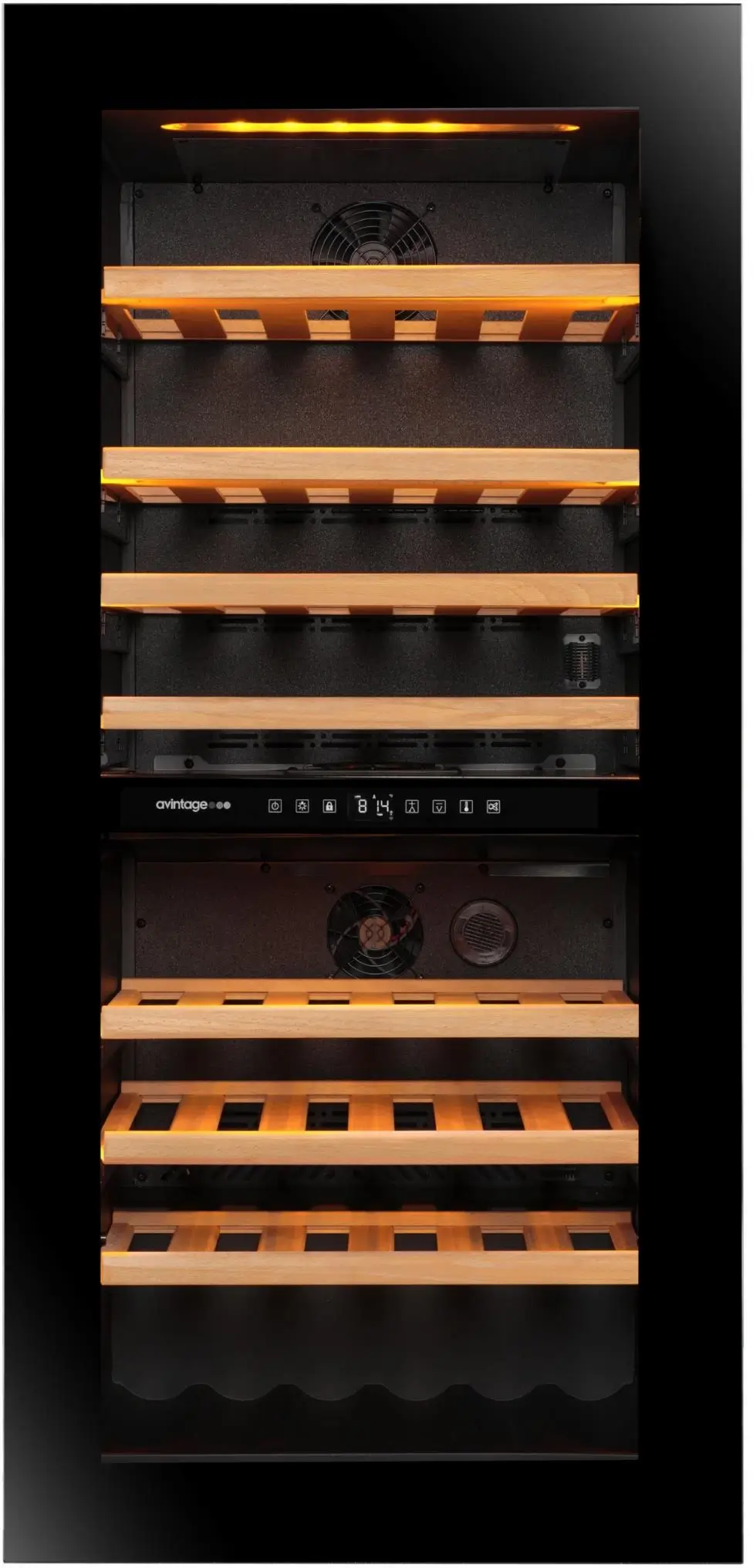 Prémiová vestavná dvouzónová vinotéka Avintage AVI122 Platinum nabízí ideální řešení pro milovníky vína, kteří chtějí udržovat své lahve v dokonalých podmínkách. S kapacitou až 68 lahví a dvěma teplotními zónami pro bílá i červená vína zajistí optimální skladování. Moderní design s prosklenými dveřmi s UV filtrem, nastavitelným LED osvětlením a systémem přední ventilace usnadňuje instalaci a dodává vinotéce elegantní vzhled.