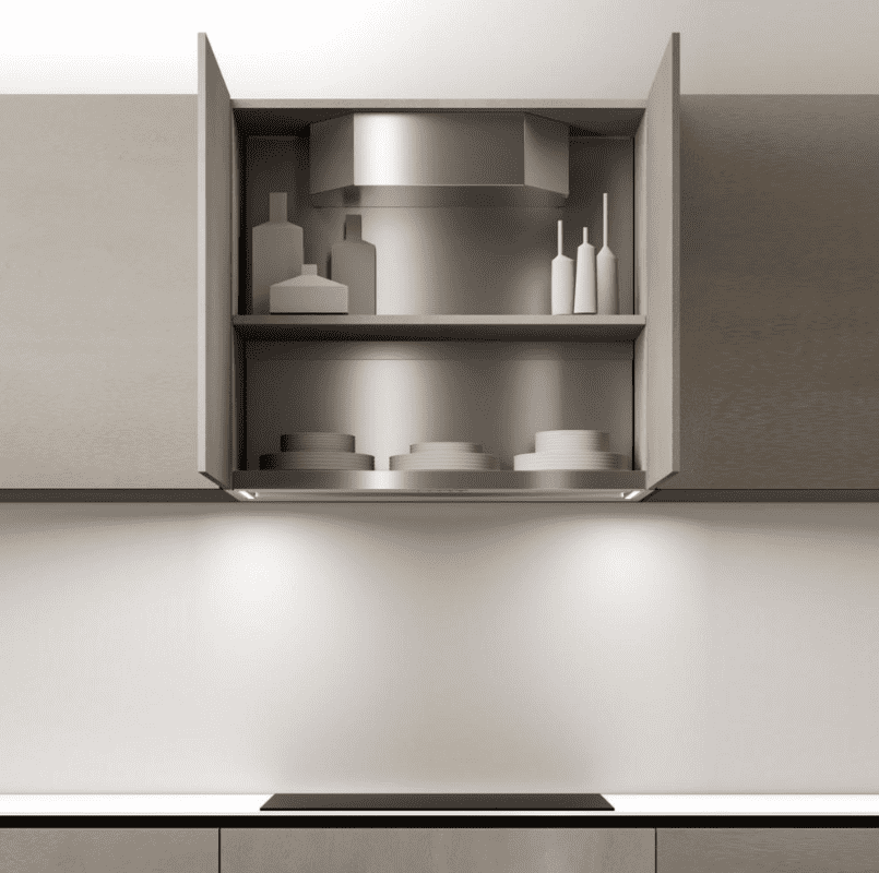 Motorová jednotka je u vestavné digestoře INSIDE IN umístěna v horní části skříňky, která nebývá příliš často využívána, a zajišťuje tak efektivnější využití prostoru skříňky. Vzduch je odváděn vzduchovým kanálem, který je umístěn v zadní části skříňky.