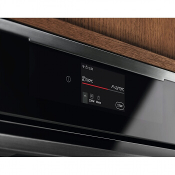 Elektronické funkce: Preheating (none, eco, fast), ukazatel teploty (°C), ukazatel zbytkového tepla, Residual heat usage (only with duration), info k servisu, Short cut keys in standby screen, doporučená teplota, denní čas, OTA programming (excluding power board), Oven light on/off selectable (2 ways: menu, direct access on home screen), 20 Favorites, 31 Languages/Text display, 6 Multi Step Cooking Functions, 90 Variety of pre-set cooking programmes Assist, akustický signál, ovládání aplikací, automatické vypnutí (jen trouby), nastavení hlasitosti minutky, Check Result (Finish Assist by remaining 10% duration) (Use residual heat screen + beep), Dětský zámek, Clock automatic adjustment, Clock style in standby (2 versions: digital, 7 segments), konektivita, čas vaření, čas vaření s odhadem konce, přičítání času, demo program s kódem, nastavení jasu disp., Display Full colour TFT touch 4.3 inches 9 x 5, elektronická regulace teploty, Electronical door switch, výběr rychlého předehřátí, jídelní sonda, automatické vypnutí jídelní sondy, jídelní sonda - indikace teploty jádra, jídelní sonda s odhadem času, tóny kláves, alarmů a chyb, aktivace/deaktivace (kromě hlavního vypínače), hlavní vypínač, denní paměť 3 dny zpětně, Microwave Power level proposal, minutka